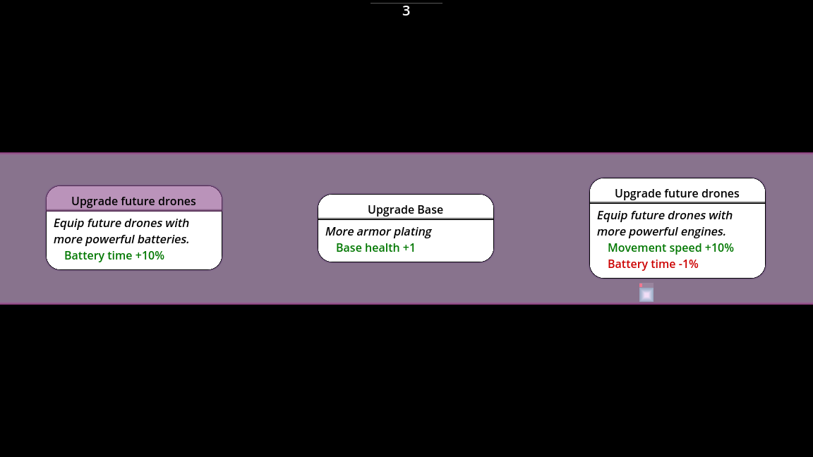(i made it harder to see with an last minute update of the overall visuals right before the deadline) - An upgrade system where you can upgrade your base and future drones after killing an (increasing) number of enemies